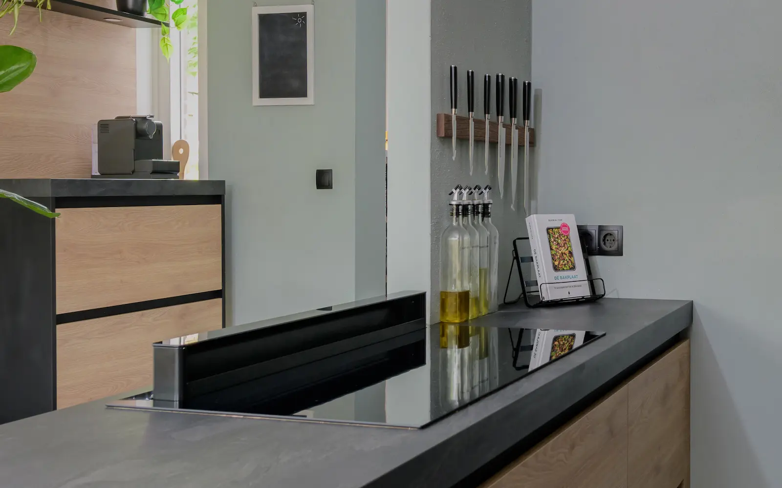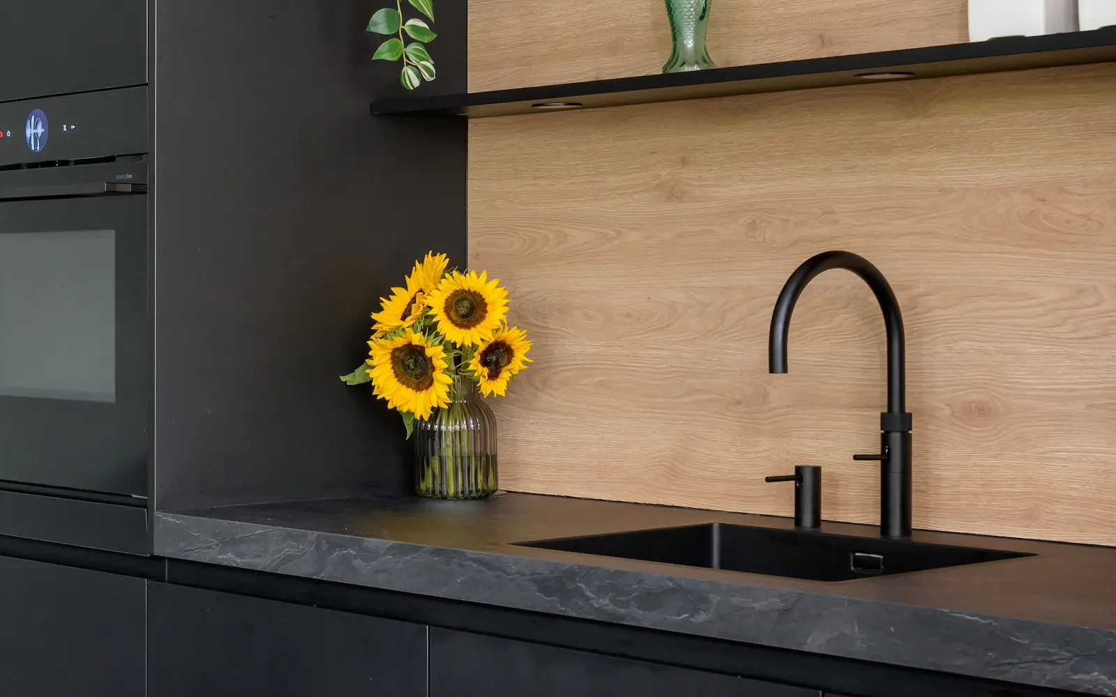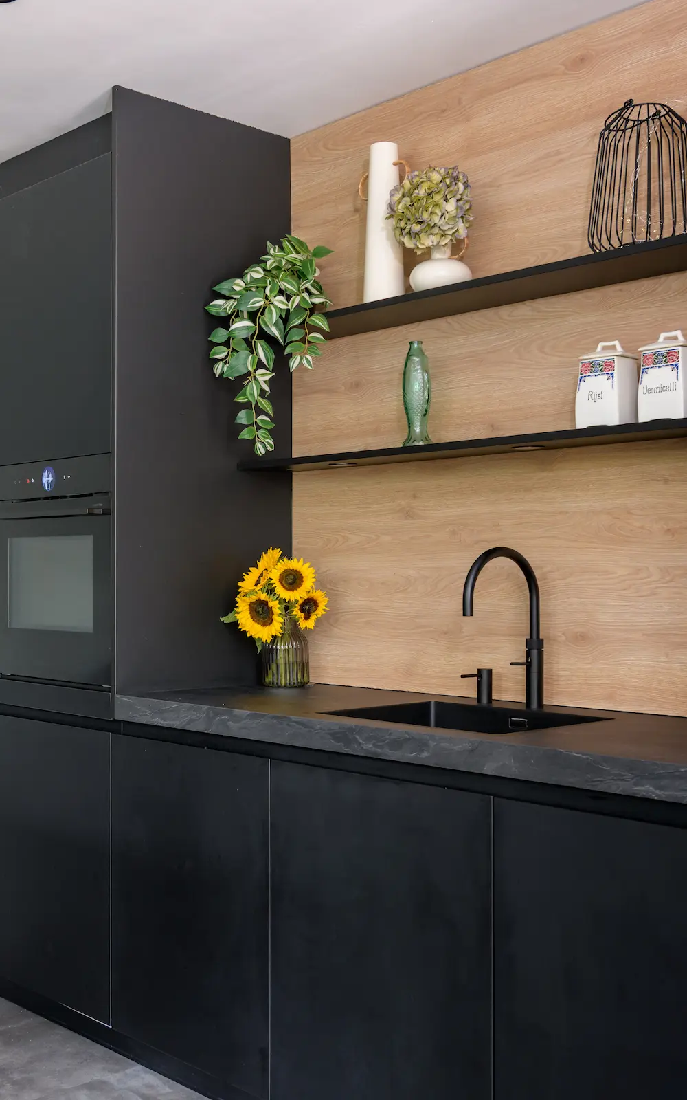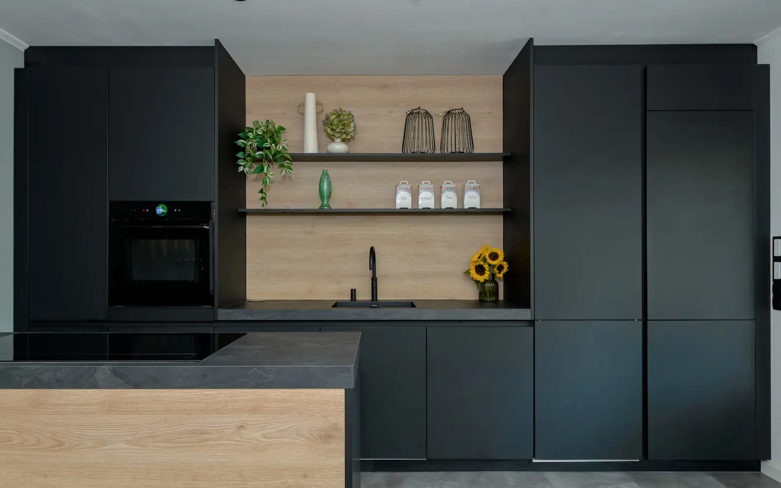 De mat zwart gelakte fronten zijn perfect in balans met de gestructureerde, eiken panelen. De donkere keuken komt prachtig tot zijn recht in deze ruimte, voorzien van talloze, hoge ramen. Het brengt de rust en de natuur van de aangelegen achtertuin naar binnen, waardoor de woning en de buitenruimte één prachtig geheel vormen.