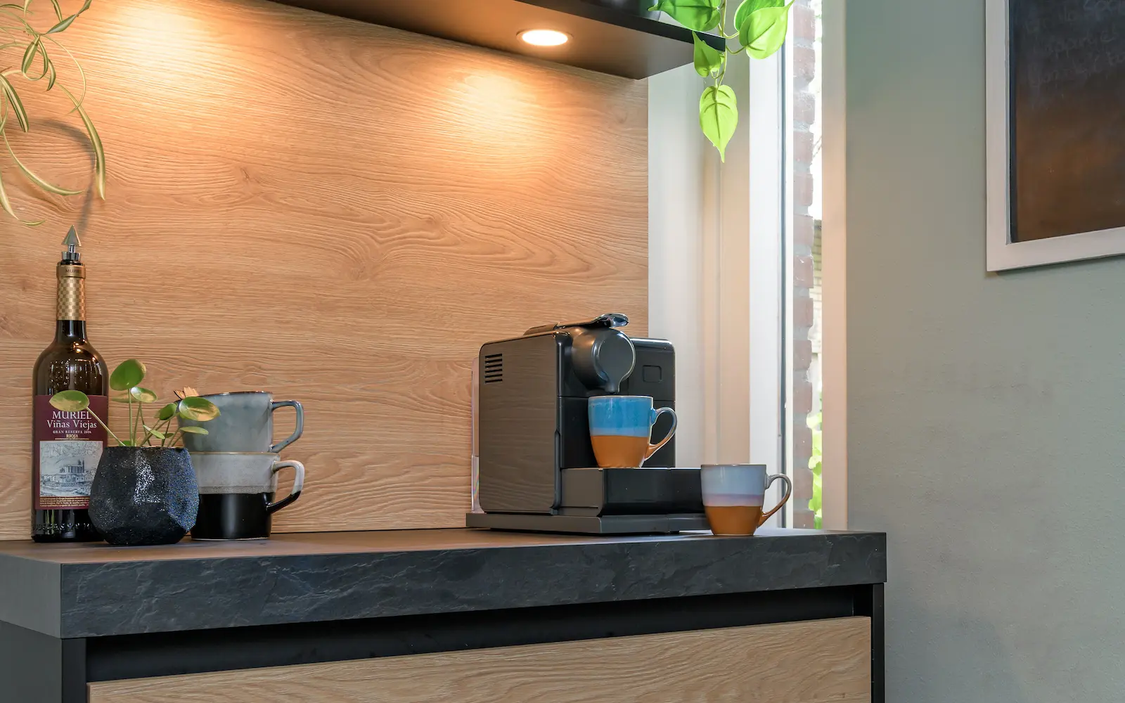 De knusse, warm aangeklede koffiecorner biedt alle gemak om de dag uitgerust te beginnen met een vers kopje koffie.